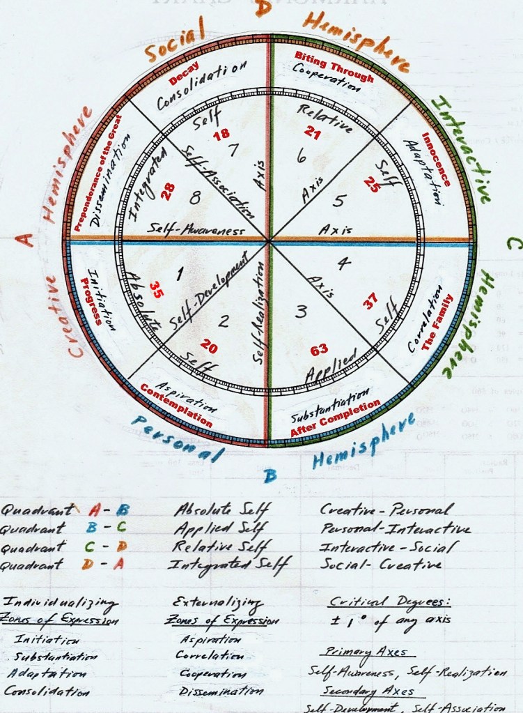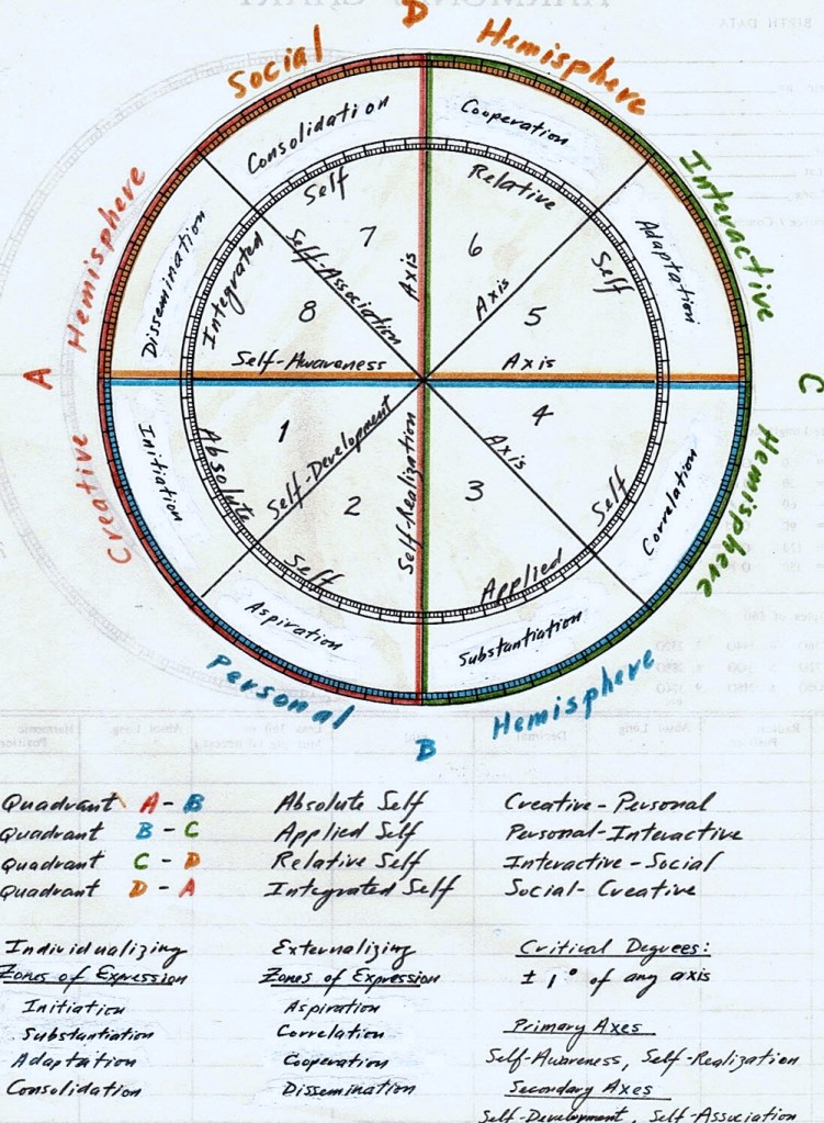 At one point in the development of ancient Greek astrology, an eight-segment “octile” house system was created. The system was based on 45-degree subdivisions of the 360-degree circle that were intended – as with all house systems – to describe mundane circumstances. I was unable to find anything conclusive about how it was used (for example, how was the twelve-sign and eight-house disparity reconciled?) so I created my own model inspired by German Cosmobiology. (Excuse the poor image quality; it was hand-drawn many years ago on the back of a blank horoscope form, but it did “clean up” a little better in the second example.) The labeling of the various features was based partly on “New Age” appropriation of Jung’s psychology and partly on my own experience with Marc Robertson’s Cosmopsychology: The Engine of Destiny and Dane Rudhyar’s eight-phase Lunation Cycle that motivated Robertson.