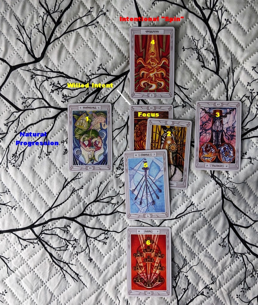 Here is a hypothetical example reading. (All cards except the “Focus” card were pulled randomly and I wove a likely narrative around them.)
