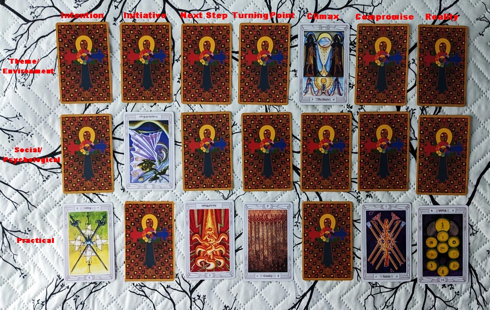 The “method to my madness” is to make sure that there are enough cards in the draw so each of the three categories has an equal chance of receiving a large enough population to “zero-in” on the goal: a convincing projection of the querent’s future circumstances over the time-frame envisioned by the reading. I’m thinking that three rows of seven positions will be both manageable and consistent with historical precedent. Only seven cards will be dealt, but they will be placed in their respective “bins” as the pull progresses. Depending on how the pattern develops, the spread can wind up with anywhere from zero cards in any one category to a maximum of seven, with four or five being the ideal number to represent the dominant motif. In the worst case the diviner will have seven cards to read in a single run with none in either of the other two series. In actual practice, though, I imagine that there will be a less lopsided distribution such that the proposed course of events can exhibit more than one trajectory.