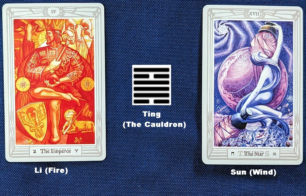 If two “dominant” cards are pulled, the more robust and assertive of the two should be used for the “upper” trigram. For example, if the Emperor (dominant Cardinal Li) and Temperance (dominant Mutable Li) appear in the draw, the Emperor would unquestionably win any “arm-wrestling match” between the two and would therefore take the upper position. If two subordinate cards are pulled, the least robust or assertive one would assume the “lower” place. For example, if The Hierophant (subordinate Fixed Earth) and Death (subordinate Fixed Thunder) are pulled, the undemonstrative nature of Taurus and Venus would obviously cede the top spot to the more vigorous energy of Scorpio and Mars.