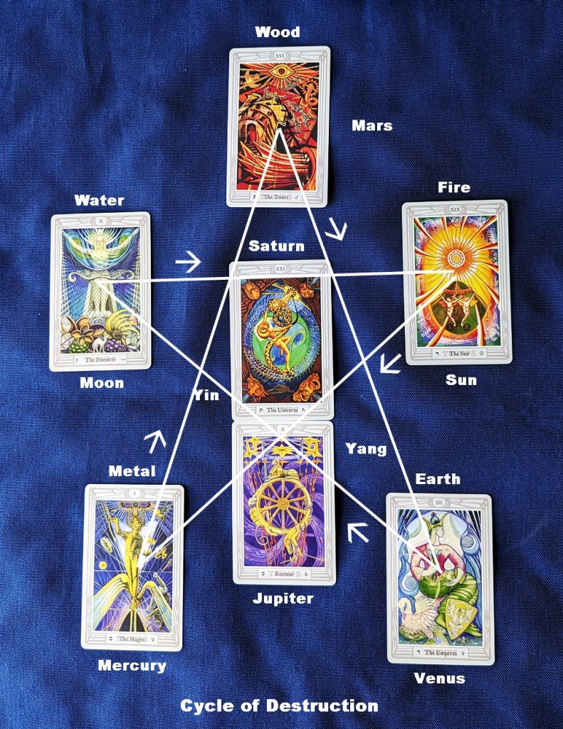 In I Ching, the Oracle: A Practical Guide to the Book of Changes, Benebell Wen presents two diagrams, the Cycle of Creation (“To support and fortify”) and the Cycle of Destruction (“To defeat and subdue”), that together depict the basis of Taoist alchemy. The former runs clockwise in an endless circle of evolution starting at the top (Wood, Fire, Earth, Metal, Water and back to Wood) while the latter displays a rotating pentagram (five-pointed star) of declension that also moves clockwise in biquintile (144-degree) “jumps” from the top: Wood, Earth, Water, Fire, Metal and back to Wood, with each agent of change “breaking down” the following one. (In Hermetic ceremonial magic, tracing this pattern creates the “Banishing Pentagram of Spirit”). Each of these cycles has the two-lobed “Taiji” (yin/yang) symbol at its center, one with yang uppermost and the other with yin at the top, resulting in seven critical factors that serve my purpose here. With a little creative tailoring, I’ve incorporated these images into the tarot-card arrays shown below. (All cards shown are from the Thoth Tarot, copyright of US Games Systems Inc, Stamford, CT.)