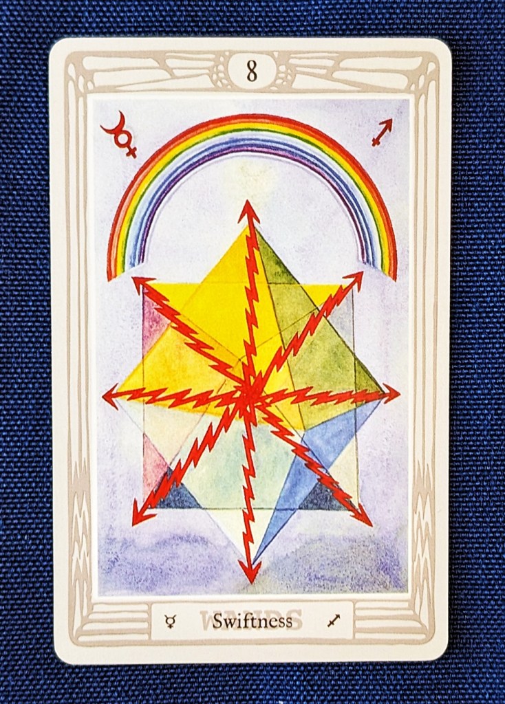 Aleister Crowley’s Description: “In the Eight of Wands, fire is no longer conjoined with the ideas of combustion and destruction. It represents energy in its most exalted and tenuous sense; this suggests such forms thereof as the electric current; one might almost say pure light in the material sense of that word. (It) belongs to Sagittarius, which represents the subtilizing of the Fiery energy; and Mercury rules the card, thus bringing down (from above) the message of the original Will; it refers to the phenomena of speech, light, electricity. This card, therefore, represents energy of high velocity, such as furnishes the master-key to modern mathematical physics.”