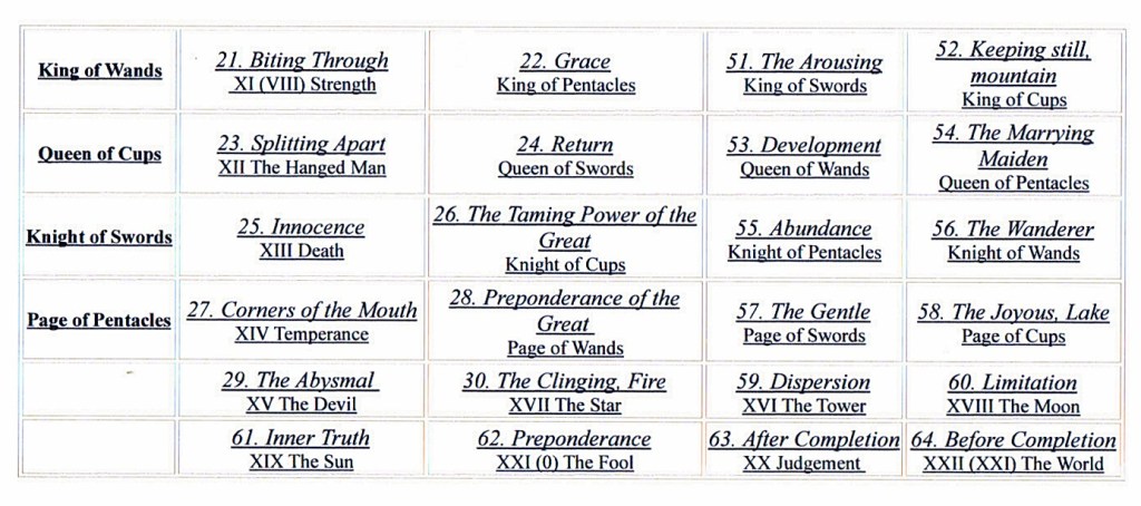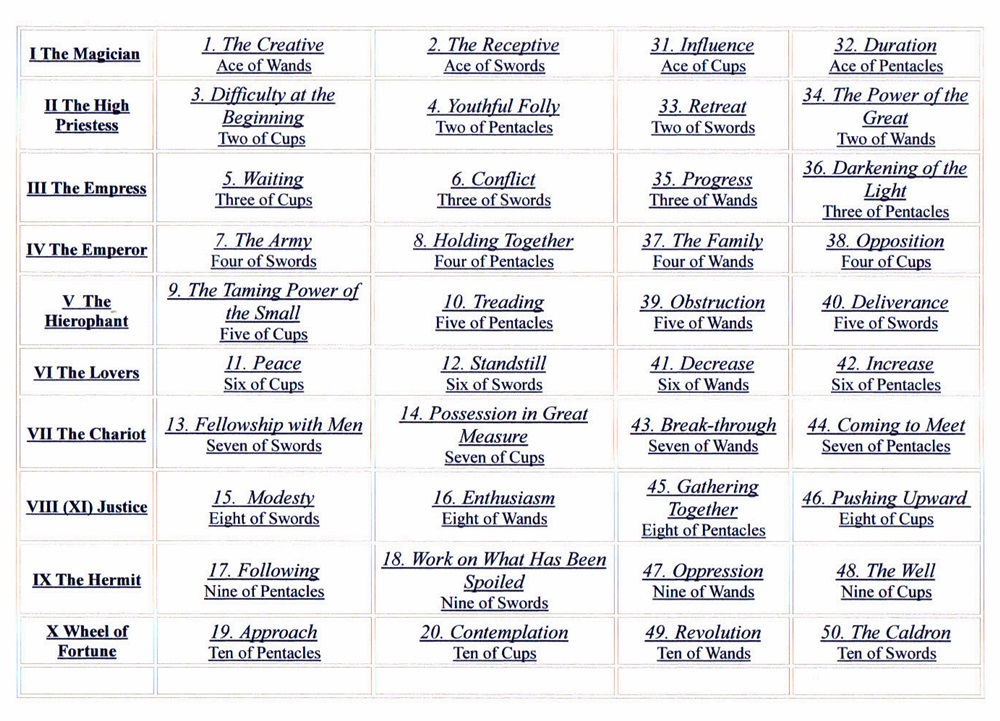 AUTHOR’S NOTE: A few of years ago I came across a table of correspondences created by a couple of Russians that links the 64 I Ching hexagrams to the 78 tarot cards in a way that nobody else has done. Their website has been taken down, so I was fortunate to have saved a copy for experimentation. Lately I’ve been exploring the syncretism between the I Ching and the tarot, and I also have Anthony Clark’s delightful I Ching Pack of oracle cards, so I decided to bring the three together in a mixed-media reading. (The I Ching text is from the Wilhelm-Baynes translation, copyright 1977, Princeton University Press, Princeton, NJ.)