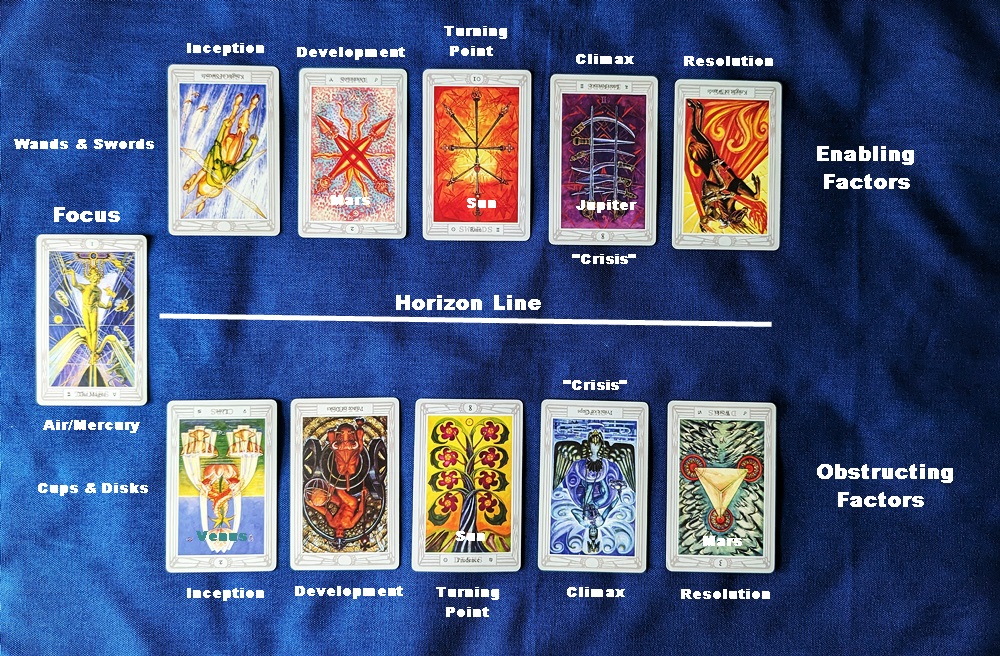 In the Golden Dawn’s system of esoteric correspondences, the Magician is associated with the element of Air and the planet Mercury. When we deal the cards into the spread, any of them that are harmonious with the nature of Air would be placed “above the line,” and those that are discordant would go below it. (Planetary and court-card “rank” associations are secondary as discussed below.) So all active and positive Air and Fire cards would be situated above since they are elementally friendly to Air, and all passive and negative Earth and Water cards would sit below, with Earth being elementally hostile toward Air and Water weighing in as neutral but not particularly helpful.