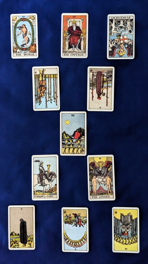 The “Situational Baseline” layer is weak, with the upright 5 of Cups and the reversed 9 and 10 of Cups suggesting halfhearted enthusiasm. The two triangles pointing upward from the baseline are topped by the Knight of Cups and the Lovers, respectively, which – if this had been a romantic reading – could almost make a go of it together as hopeful “Clarifying Factors” for the murky bottom row. But the 8 of Cups as the “Choke-point” card throws a bucket of cold water on the pair, bringing any progress to a dead stop.