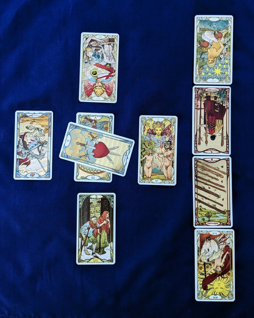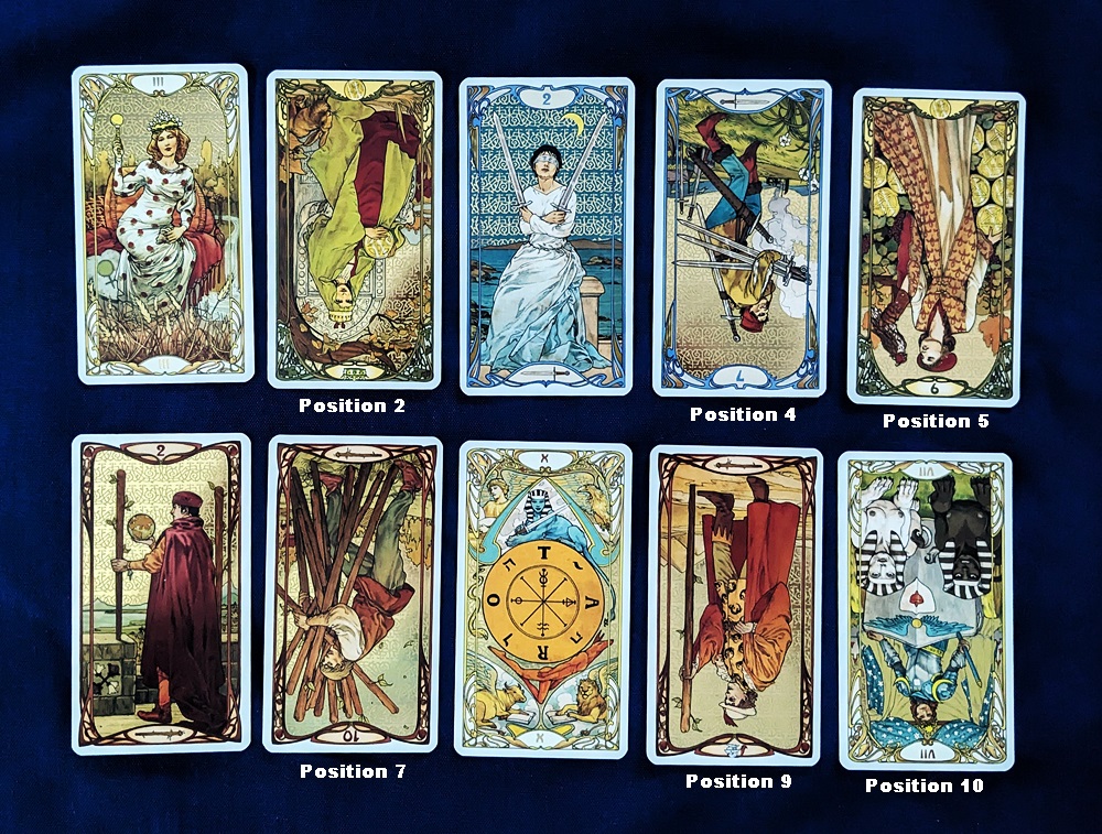 The top ten cards from the rest of the deck yielded six reversed cards, which I set in their numerical positions in the spread. Although they should have been placed under the first set of cards as “shadow” influences, I laid them on top for clarity. It’s very interesting that all of the affected cards except the 3 of Swords were also reversed, and the reversed “shadow” cards just dig them a deeper hole. The sheer number of reversals in the final layout suggests a lot of second-guessing to me.