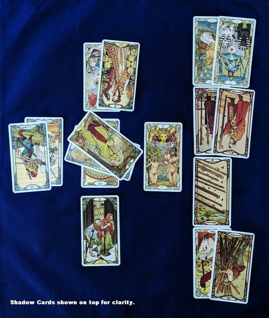 I would examine only as many additional cards as appeared in the original spread. So, for example, if I’m using the 10-card Celtic Cross, after the deal I would take ten more cards off the top of the shuffled deck and look for reversals. I haven’t decided yet, but it may be useful to tie any I find into the original spread positions of the same number as their order in the new sequence. This would turn them into individual “shadow” cards providing hidden messages for each of those positions, with the reversal making them just a little more mysterious. Technically, they are a form of “clarifying” card but they are all generated at the time of the original shuffle and not produced on-the-fly when the need arises. When I choose to apply clarifiers, I like to have them built into the structure of the spread and kept in reserve until – and only if – called on, so this approach works for me since it aligns with my reversed-card metaphor of “turning over rocks to see what crawls out from underneath.”