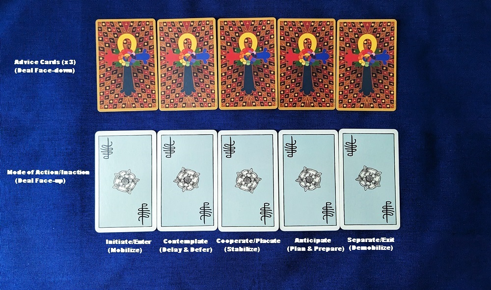 Read the four-or-five-card series in the column represented by the specific mode of action or inaction as advice for entering that particular response scenario.