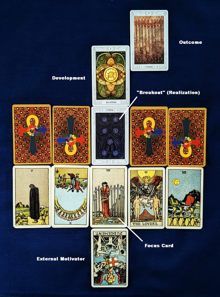 You will need two decks for this spread, one for the fifteen “advice” cards in the top row and one for the “mode of action/inaction” cards below that will include the randomly-placed significator or “focus card. The result of the draw will be a four-or-five-card reading – four if there are no cards underlying the significator and five if there is an “external motivator” card beneath it.