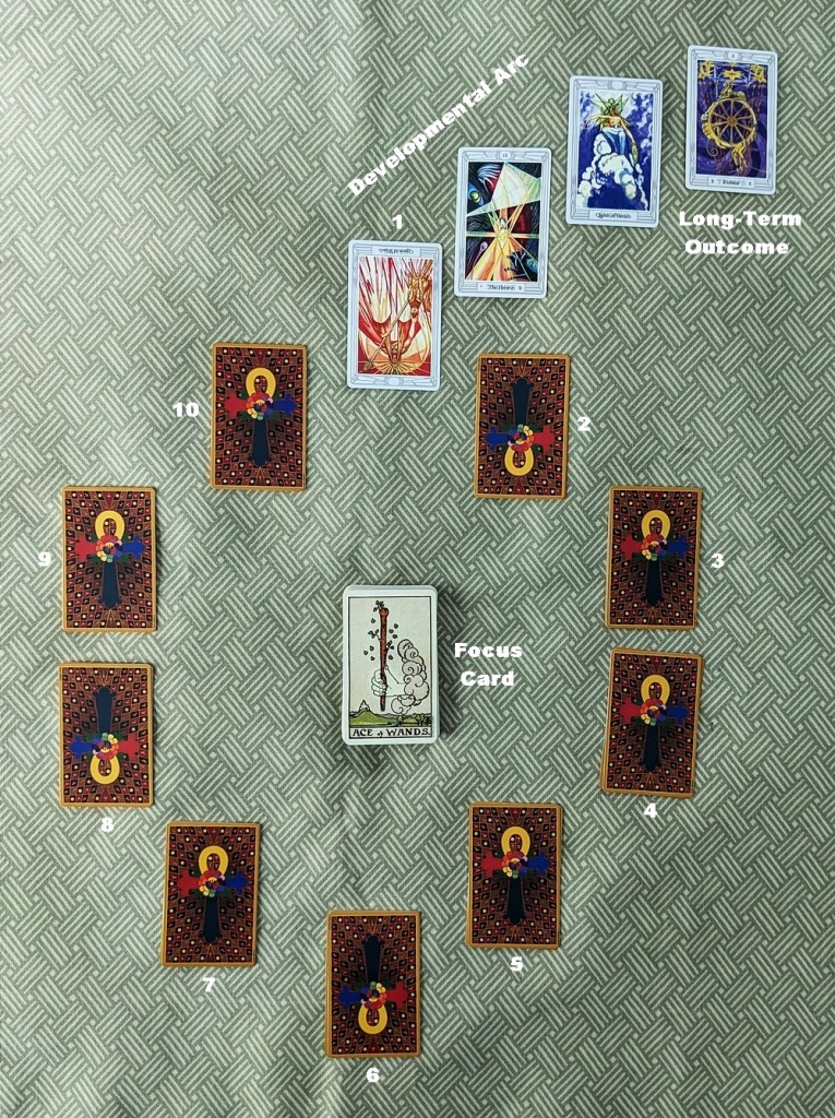 You will need two decks for this spread, a full deck to populate the ten “outer” positions of three cards each and another partial deck from which to draw the significator or focus card that identifies the “inner” (or intrinsic) nature of the issue. The second deck should be stripped of its trump and court cards, leaving only the 40 cards of the Minor Arcana. Reversal may be used with both decks.