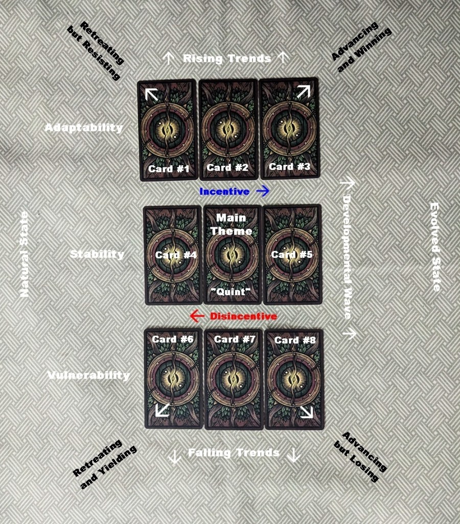 The “quintessence” card at the center – always a trump card – serves as the “main theme” or archetypal backdrop for the reading, representing a multi-dimensional “crossroads” in the matter. It is calculated numerologically from the face values of the other eight cards, and should be read as the “linchpin” of all four axes of the cross, one horizontal, one vertical and two diagonal, which can be read in both directions to create six rising and falling three-card lines and two that are level and therefore stable, inherently more prone to gradual advancement than backsliding. The rows and columns that don’t pass through the “crossroads” can be mined for supplemental information.