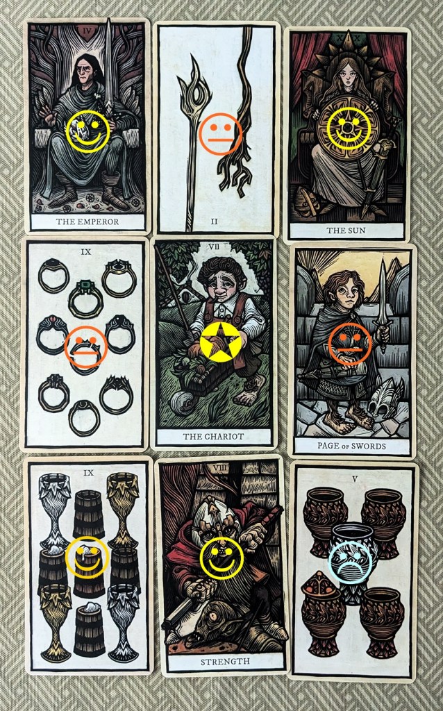 The three most influential cards in the pull were trumps, creating some difficulty in finding the correct path; all are Fire, conveying the need for an assertive approach. The Page of Swords has “one oar in the water” but comes in a distant fourth.