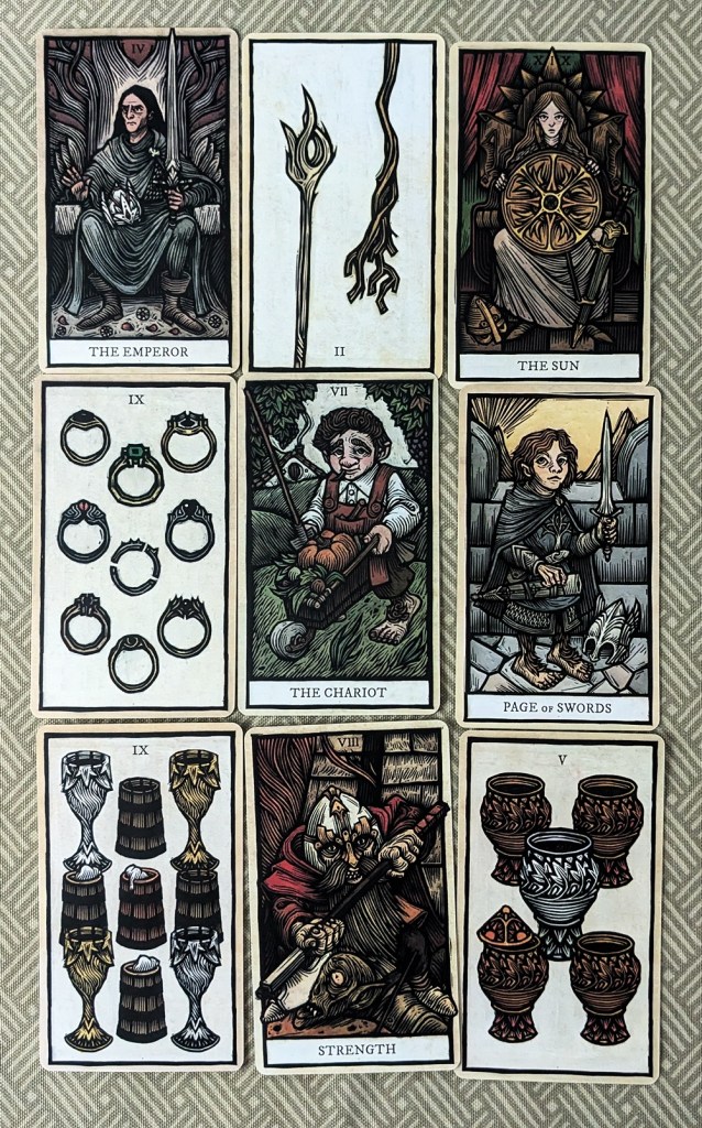 AUTHOR’S NOTE: Here is a spread that can go in multiple directions depending on the nature of the cards pulled. Highly-influential cards (whether fortunate or unfortunate) can distort the “shape” of the pattern by pulling or pushing the narrative along one developmental path or another. Although the temporal flow of the spread moves from left-to-right (the “Developmental Wave”), there may be counter-currents that “move against the tide.” Reversals may be used with this spread. (All images are from the Lord of the Rings Tarot [2022], copyright of Middle-Earth Enterprises, published under license by Insight Editions, San Rafael, CA.)
