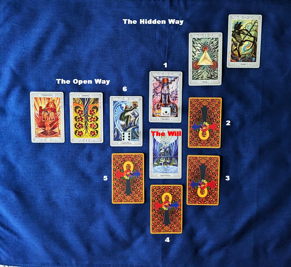 AUTHOR’S NOTE: Here is a spread that is designed to reveal the “way forward” in any situation involving a “willed” ambition or purpose. It offers both an “Open Way” that is obvious to everyone involved in the affair and a “Hidden Way” that has more clandestine dimensions and implications. Working with the Thoth deck as an extension of the Will seems natural, although here I’m talking more about the egoic Will of the Emperor than the True Will or Magickal Will of the Magus. On the other hand, I believe Crowley did say somewhere that every act of Will is a magickal act. Once again, contrary to popular opinion, I do use reversals with the Thoth deck, to good effect.