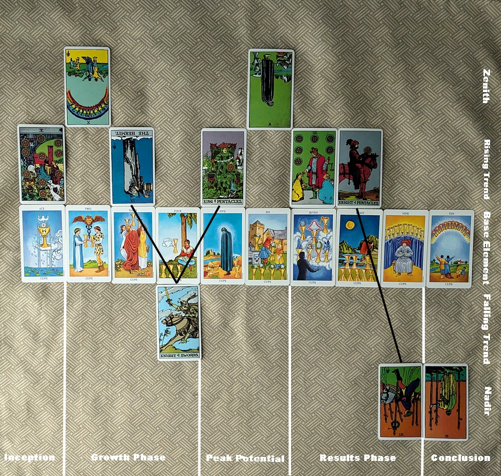 After the debacle, the first two cards of the “Results Phase” bring in the generous 6 of Pentacles and the Knight of Pentacles, together depicting a free-spending younger person of a similar constitution to the King of Pentacles (that is, conservative and emotionally “safe”) but more physically energetic and less prone to clamp down on frivolity. Things seem to be looking up. However, the ominous 7 and 8 of Cups in the “baseline” row immediately below suggest “standing in quicksand” more so than “walking on water.”