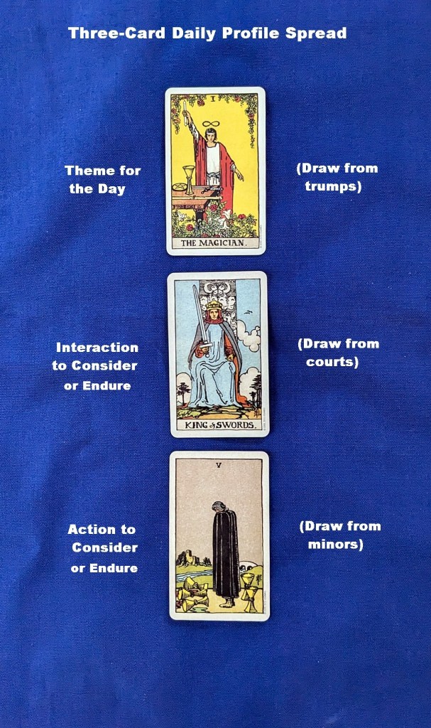 I decided to come up with a slightly more structured approach that acknowledges three different levels of significance in the affairs of the upcoming day: one detached and personal; one interactive and communal; and one an overarching theme for the 24-hour period. It requires splitting the deck into trump, court and pip sub-packs, then shuffling and dealing them separately to populate the three positions of the layout. Reversals are not used since this spread looks first at opportunities and only secondarily at exposure to upset conditions.