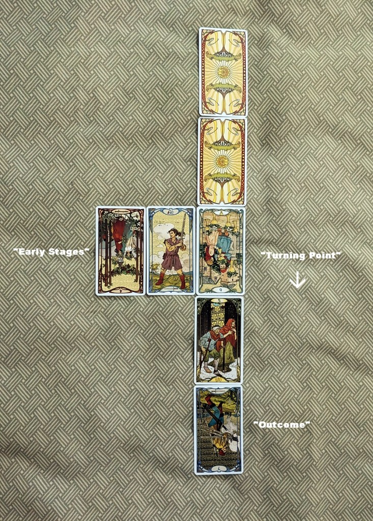 Determine whether the third card is upright or reversed. If it’s upright, turn the two cards above it face-up; if it is reversed, turn over the two cards below it. Read the additional cards thus revealed as the “rest of the story” beyond the testimony of the first three, with the last one as the eventual outcome. There is no particular significance to whether the “turning-point” card redirects the reading up or down, it is just a “sign-post” for choosing the path. (However, it might be reasonable to assume an “upturn” or “downturn” in circumstances, in which case it would be useful to compare those cards to the two that weren’t selected to see whether there was a “missed opportunity” or a “dodged bullet.”)