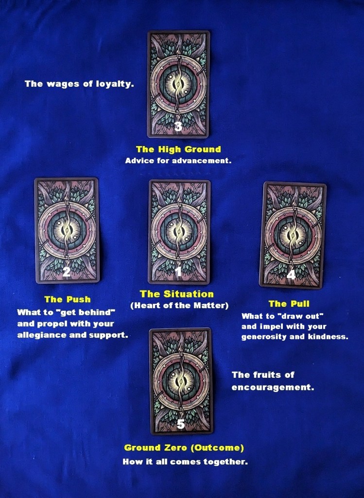 As can be seen from the layout, the forthright incentives of loyalty come first in Card #2 (a nudge of the “stick,” although in real-life terms it may just come down to a heartfelt commitment, sans prodding). If that isn’t sufficient to produce results as shown by a mid-cycle “advisory” overview (Card #3), the tempting enticements of generosity and kindness can be leveraged (Card #4, the lure of the “carrot”). Card #5 is the standard outcome scenario. The position meanings are self-explanatory, showing that what we get out of a situation is the result of what we put into it, a typical cause-and-effect tableau with no mystical implications. This spread seems to be ideal for use with either “pip” decks like the Tarot de Marseille or the Lenormand oracle with its literal focus.