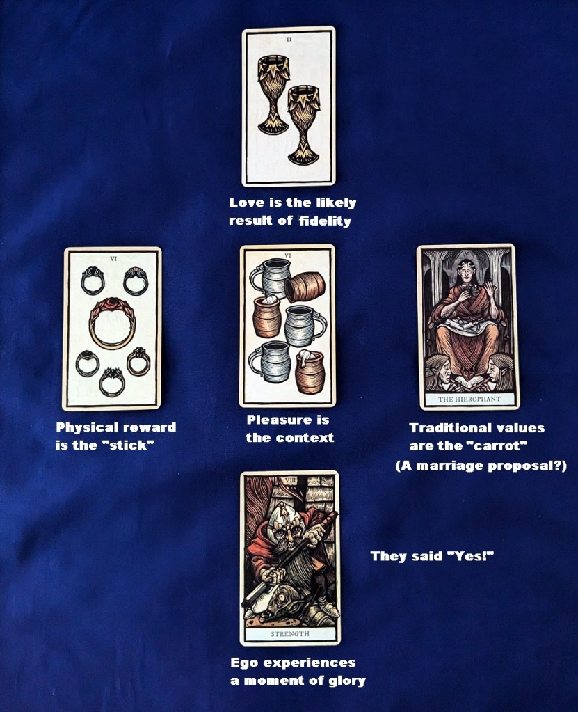 Here is a random pull that puts the spread into motion. It looks like a romantic forecast, and I could not have hand-picked a better series of cards to tell its story. I can read it as “one thing leads to another” (emotional and physical attraction, love, marriage and connubial “staying-power”) or maybe as a Lord of the Rings twist on the old children’s rhyme: “First comes love (well, maybe ‘lust’), then comes marriage (once the dowry is settled), then comes Gimli with a baby carriage.” (Try to envision that one if you can! We would have to relocate John Rhys-Davies to Monty Python’s “Pramalot” chorus line and relieve him of his weapon.)
