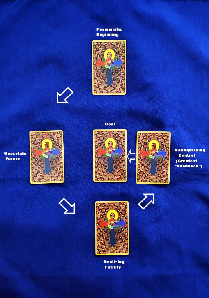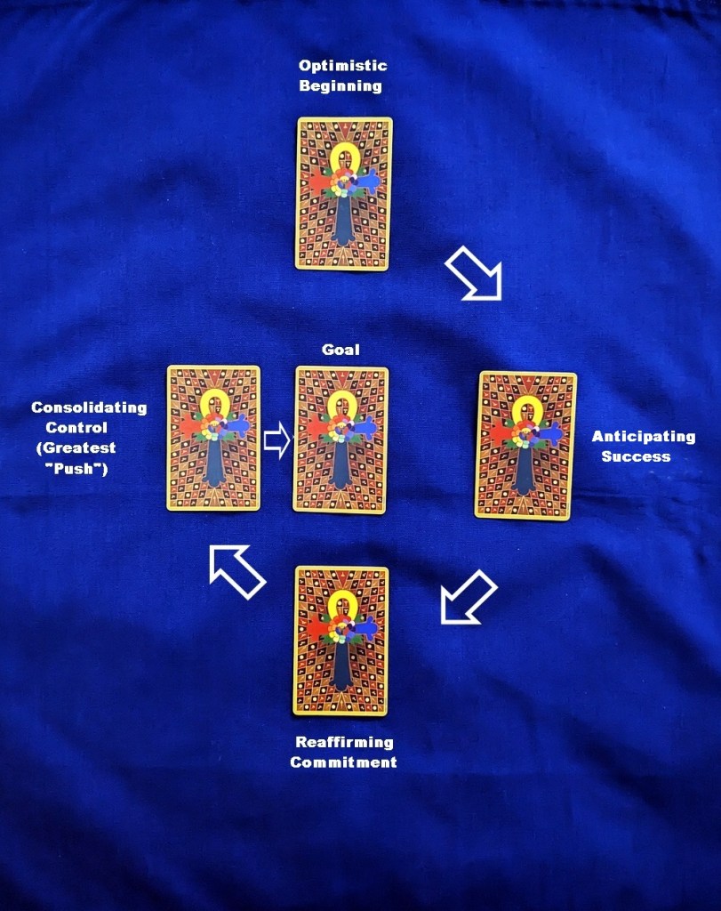AUTHOR’S NOTE: Here is an ambitious concept aimed at addressing the premise that, according to Dr. James Wanless, “There are no bad cards, only opportunities.” (Conversely, there are no entirely good cards, only fortuitous hints.) After choosing a card to represent the goal of the reading, I’m using the same four randomly-drawn cards to show both an optimistic and a pessimistic trend in the matter by establishing and then reversing their order in two countervailing spiral arrays.