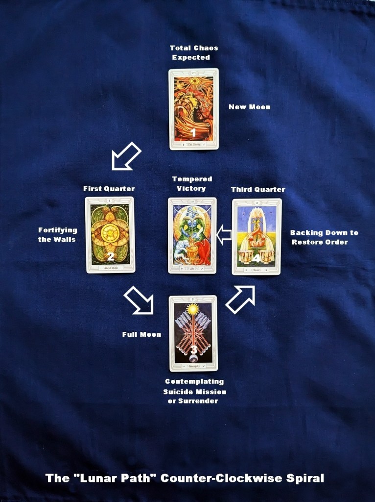 For the lunar spiral I turned the sequence around so it begins with the Tower and proceeds through the Ace of Disks and the 9 of Wands to arrive at the 2 of Cups. In this “descending” order, the Tower suggests recognizing early on that circumstances exhibit ominous signs of impending collapse, demanding urgent action; the Ace of Disks shows that its foundations are in desperate need of shoring up; with the 9 of Wands it is “walking a knife’s edge” between salvation and destruction; and the 2 of Cups portends ultimately caving in to compromise in order to salvage at least a modicum of success. There is clearly a moderating trend here that might be construed as furtively “backing into victory.”