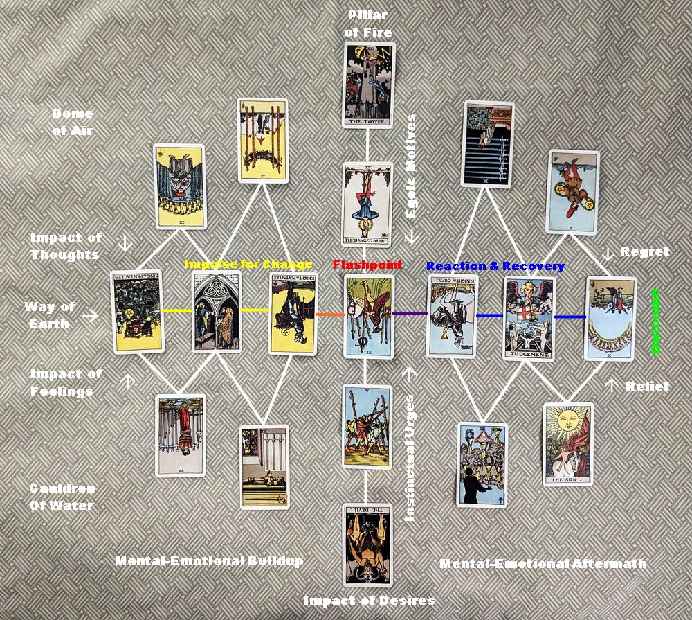 It is composed of a seven-card line augmented by two four-card sets of “before-and-after” modifiers (a left-to-right primary Earth row and two secondary Air and Water arcs), and a vertical four-card Fire array that is perpendicular to the flow and provides leverage to the pivotal turning point at the confluence of Earth and Fire. Except for the four vertical cards that form a double-ended continuum converging on the critical juncture, these supplemental cards are not to be read as a sequence but only as sidebar commentary that can “color” the main theme. I originally envisioned this to be a medium-to-long-range life-reading spread, but it is suitable for any evolving situation that is expected to encounter numerous subjective variables of an intellectual, emotional, egoic and instinctual nature.