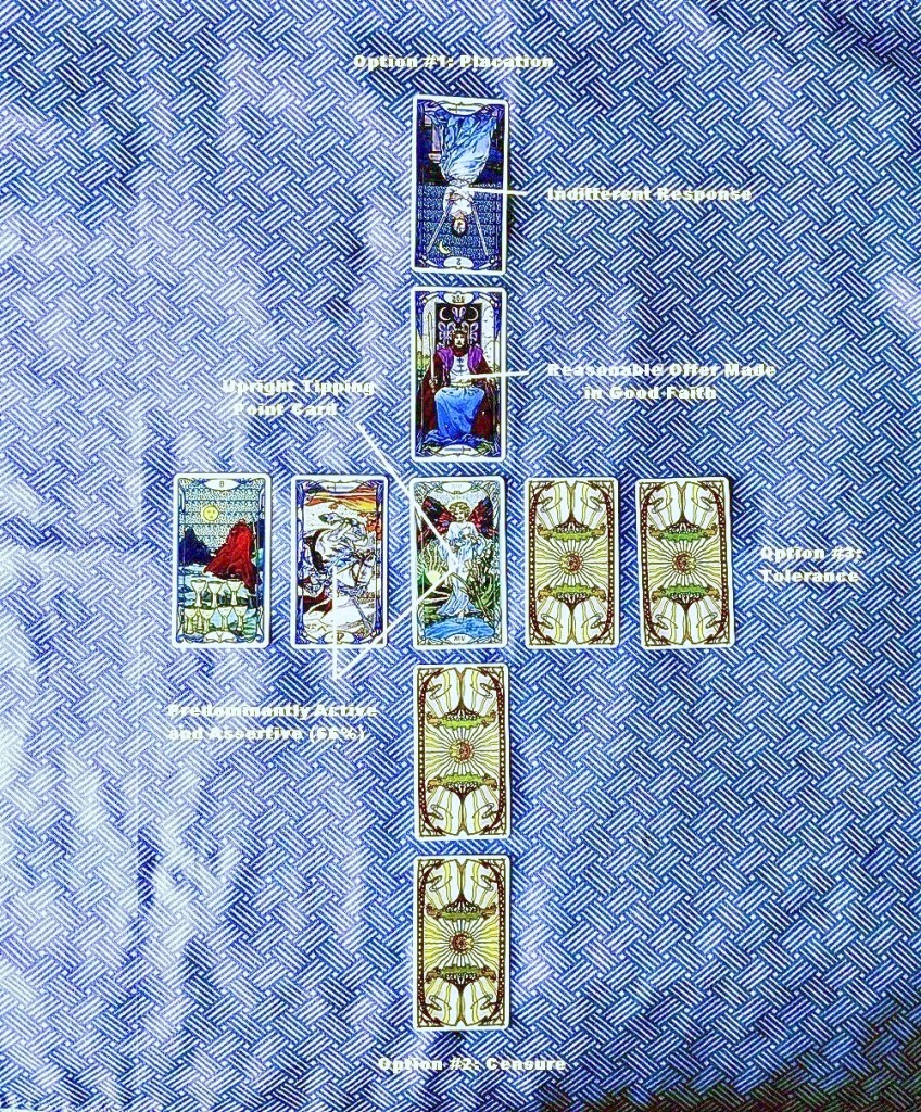 AUTHOR’S NOTE: In many decision-making scenarios, the act of choosing will reach a “tipping point” at which we must resort to motivating or persuading another person (or entity) involved in the situation to either contribute to our efforts or step aside if we are to advance. We might have to appease or reward them in order to gain their cooperation; to chastise or coerce them if we are to clear our path of obstacles; or to just “push through” the resistance and continue on our way. It might come down to an offer, an ultimatum or an “agree-to-disagree” compromise. Here is a spread that captures these three options. It requires use of a deck that supports reversed cards, and is an elaboration of an earlier spread in which I used reversal to redirect the narrative flow. (All images are from the Golden Art Nouveau Tarot, copyright of Lo Scarabeo, Torino, Italy.)
