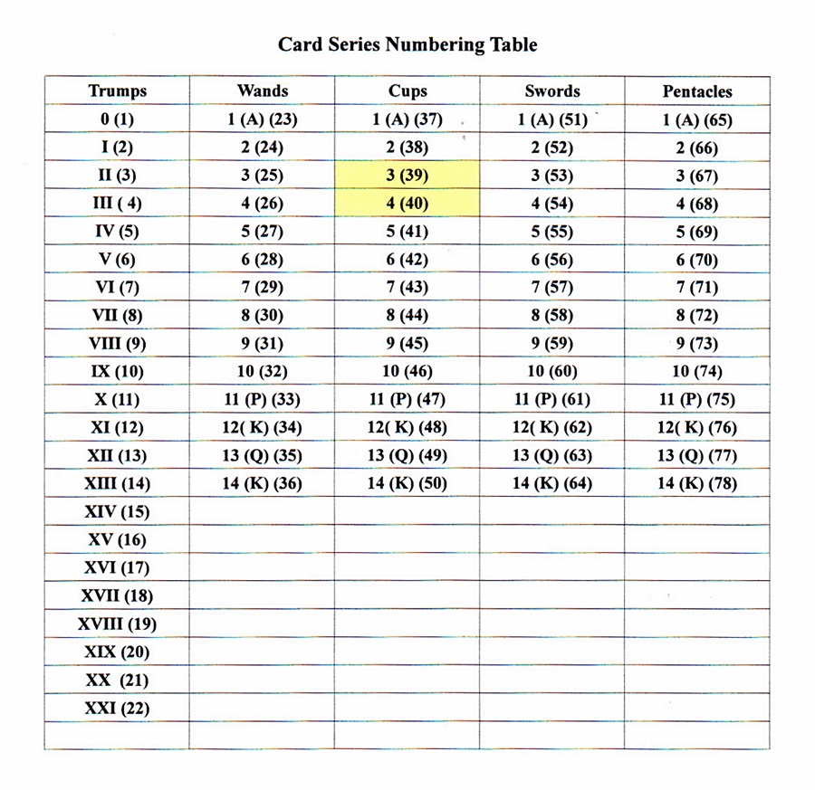 However, before fleeing the scene, it is worthwhile to evaluate whether one of the combatants might take an advantageous forward position in the field, thus gaining a strategic advantage. There are two ways to do this. One is to find the card that sits at the numerical midpoint between the two cards in each column (see the table below) and place it in the contested area between the rows, then decide whether its energy affects one adversary or the other in a way that could either advance or impede its progress. The second way is to perform a “binary synthesis” calculation for the two cards in each column by adding together their face values (and reducing the sum numerologically if necessary) to come up with a trump card to be similarly placed between the rows and examined in the same way for consequences. In either case, one or more of these cards could create an opportunity for a break-out assault or the risk of an unstoppable incursion by the enemy.