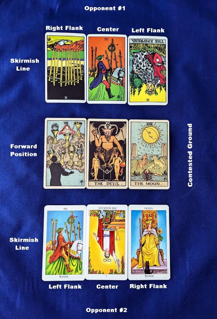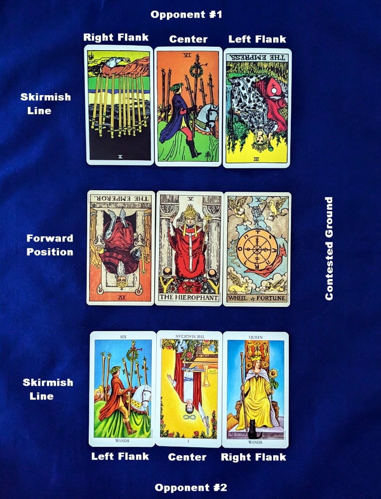 Begin by shuffling Deck #1 while concentrating on the matter, then deal three cards face-up, from left-to-right, into the top row to signify Opponent #1. Reversals may be used to imply disarray or lack of readiness for combat.