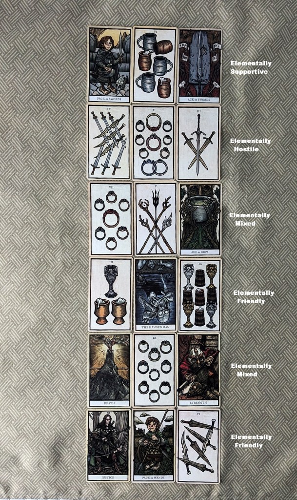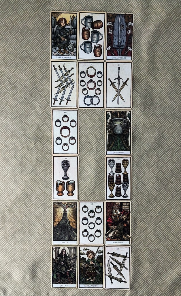 Here is an example reading to illustrate the process. I typically don’t use reversals with this “pip” deck but I certainly could have. The querent is a man I’ve read for previously who has a powerful emotional and physical attraction toward another individual, and I’m telling his story in the first person rather than endlessly repeating “the querent, the sitter, the seeker,” etc in order to streamline the narrative. (All of the cards are from the Lord of the Rings Tarot, copyright of Insight Editions, San Rafael, CA.)