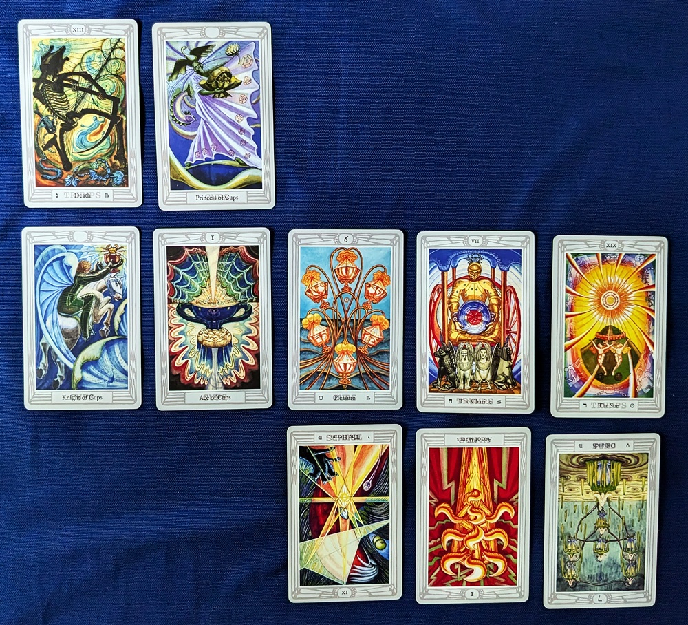AUTHOR’S NOTE: I’ve encountered many productive parallels between the oracular character of the Chinese Book of Changes and that of the Western tarot cards, but this one seems particularly useful. (In this context I’ve consulted both the classic Wilhelm/Baynes English translation and Benebell Wen’s recent book, I Ching, The Oracle: A Practical Guide to the Book of Changes.) I used the Thoth Tarot (copyright of US Games Systems Inc, Stamford, CT) for my purpose here.
