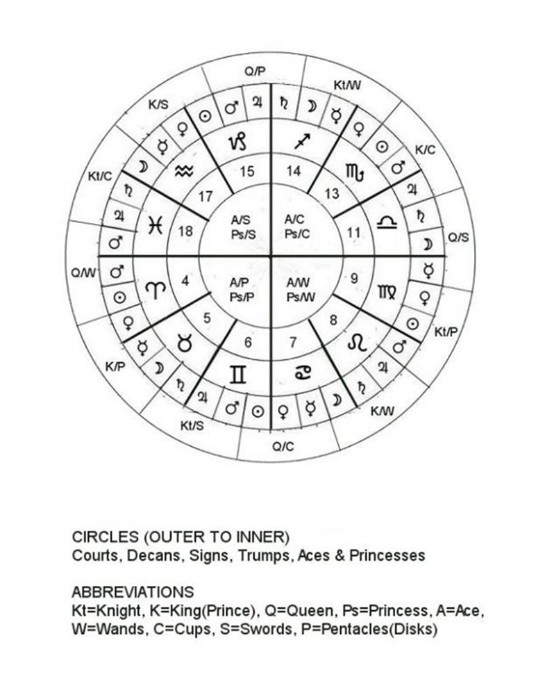 Although I’m not proposing that imaginatively reshaping the interpretation of a tarot card’s meaning to be something less inscrutable bears a close resemblance to reverse engineering, here I’m floating the idea that there is an existing architecture by which to find useful counterparts for most of the cards in the deck: the Golden Dawn’s “Chaldean” wheel of astrological correspondences. That layout correlates every “pip” card with its antipodal partner of the same number and complementary suit; every court card of the same rank in two elementally-friendly suits facing one another across the wheel; and every trump card of zodiacal significance and compatible element, Fire to Air and Water to Earth in contraposition. Only the seven planetary and three primary elemental trumps escape this pattern, but there are ways to work around that limitation as I’ve discussed in the past.