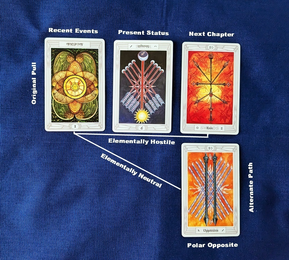 Much like the concept of “moving lines” in I Ching divination that produces a new hexagram, the premise would be to substitute the diametrically-opposite card for the one in the spread that won’t cooperate, thus creating a new reading with a parallel trajectory. Ideally, this circuitous path to understanding will be illuminating and won’t wind up being even more confounding than its predecessor. (As a side note, unlike the I Ching transition that swaps passive yin lines for active yang lines and vice versa, the replacement card will not be of the opposing polarity but rather of the same positive or negative energy, providing some continuity to the narrative.) While I’m not entirely on-board with all of the Golden Dawn’s esoteric assumptions, there is enough credibility in them to make for a reasonable working model.
