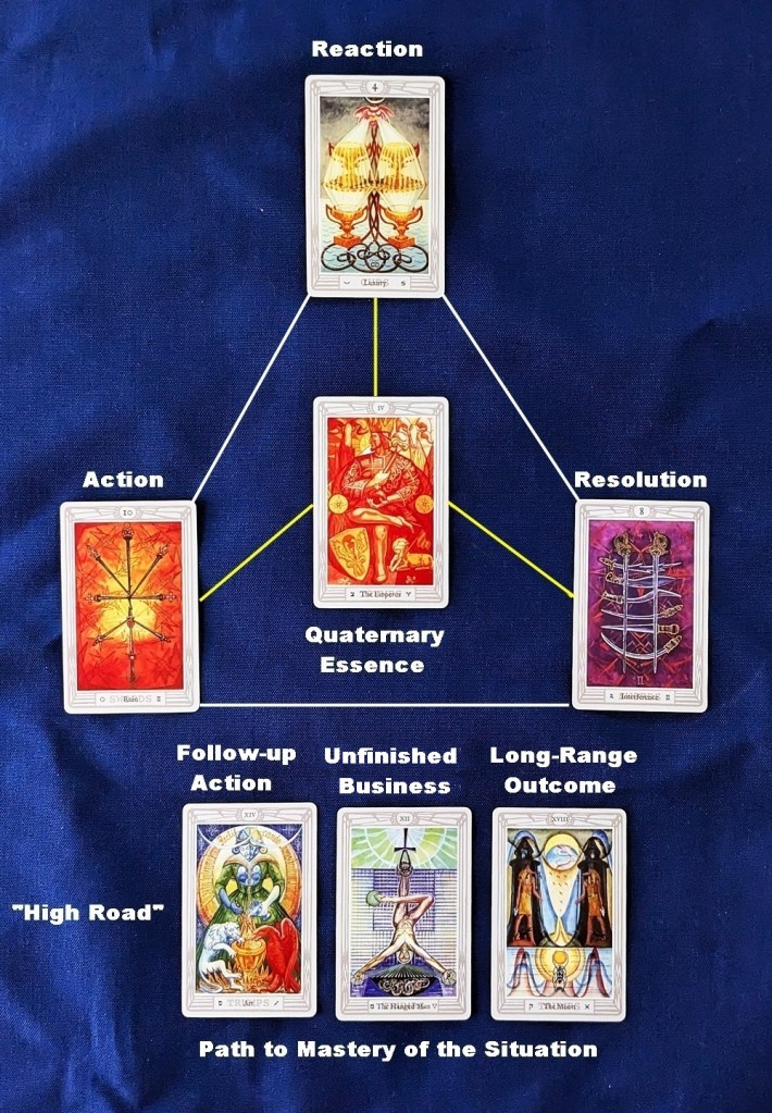 Once the quaternary essence has been calculated, three more “ternary essences” can be formulated from the three two-card sets of the original pull. (I’m indebted to Alejandro Jodorowsky for this technique.) This will create a three-card line showing the “high road” the quaternary essence can take in its quest for mastery of the situation. (All of these “essences” will be Major Arcana.)