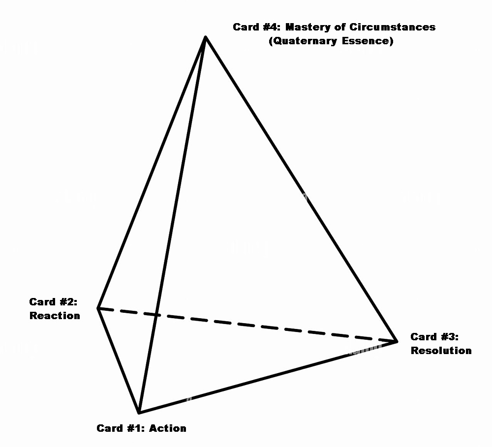 AUTHOR’S NOTE: In “The Problem of the Fourth” (Part Five of A Psychological Approach to the Trinity), Carl Gustav Jung observed “There are three, but where is the fourth?” There are numerous tarot spreads that use a tripartite motif: past/present/ future; action/reaction/resolution; thesis/antithesis/synthesis; if/then/else; etc. But here I’m projecting that planar model into three dimensions with a fourth “quaternary essence” card derived via numerological reduction from the randomly-pulled series. This card is intended to supply the “. . . therefore” wrap-up to the situational outlook of the first three, ideally offering advice on how to leverage the initial conclusion for the higher purpose of circumstantial mastery (in other words, responding with masterful authority in the final analysis rather than being “done in” by near-term events and having to live with the fallout).