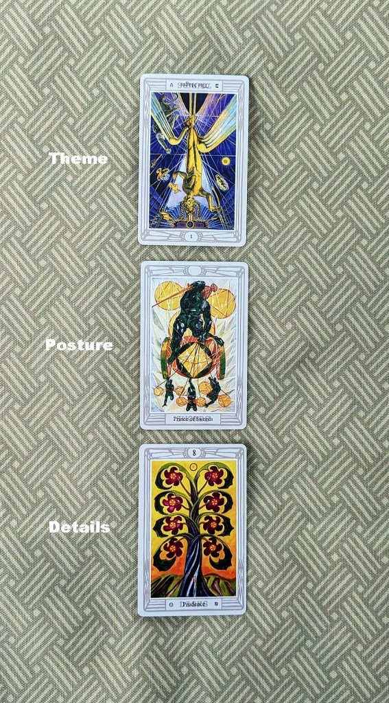 Begin by separating the deck into trump, court and pip card sub-packs, then concentrate on the question as you shuffle each one individually. (Reversals may be used to suggest oblique influences.) Next, deal the top card from each set in a vertical pattern, with the trump card at the head of the column, the court card in the middle and the pip card at the foot, and read them with the randomly-drawn court card as the “Significator” showing the recommended stance and the other two as the variables that it has to work with. (While it is possible to purposely select and place the court card to represent the querent as is commonly done, where’s the fun in that? I think allowing for randomness can yield surprising and revealing results.) Below is an example reading to illustrate this concept: