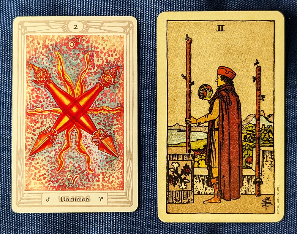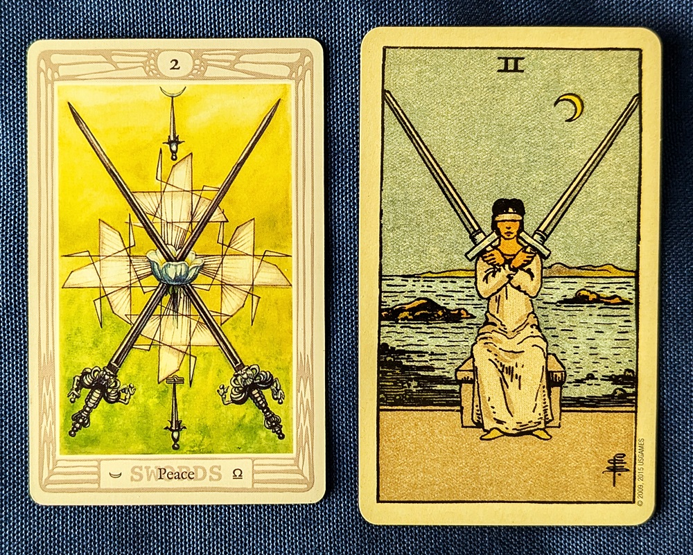 In the Thoth 2 of Swords, the idea of “Peace” is not particularly convincing given the brooding color scheme and the rather nervous abstract “white rays” emanating from the center; Crowley mentions “latent antagonism” within the apparent composure of the crossed swords. For me it suggests a touchy situation that could go either way. The RWS 2 of Swords always reminds me of “analysis paralysis;” the woman is in a quandary over which way to turn so she is reluctant to do anything at all. In the Thoth image the “third party” is the blue rose that, according to Crowley, represents “the influence of the Mother” (which I think in this context refers to the “Dark Mother” of Binah) that intensifies the sense of discord. She could be a “meddling mother-in-law;” the notion of “peace” is foreign to her unless it is the none-too-conciliatory quietude of matriarchal sovereignty (an inhospitable Mother Nature that provokes adversarial sentiments). The blindfold as “third party” in the RWS scene implies an inability or unwillingness to see the truth of the matter. Both images intimate being “armed to the teeth and ready to pick a fight.”