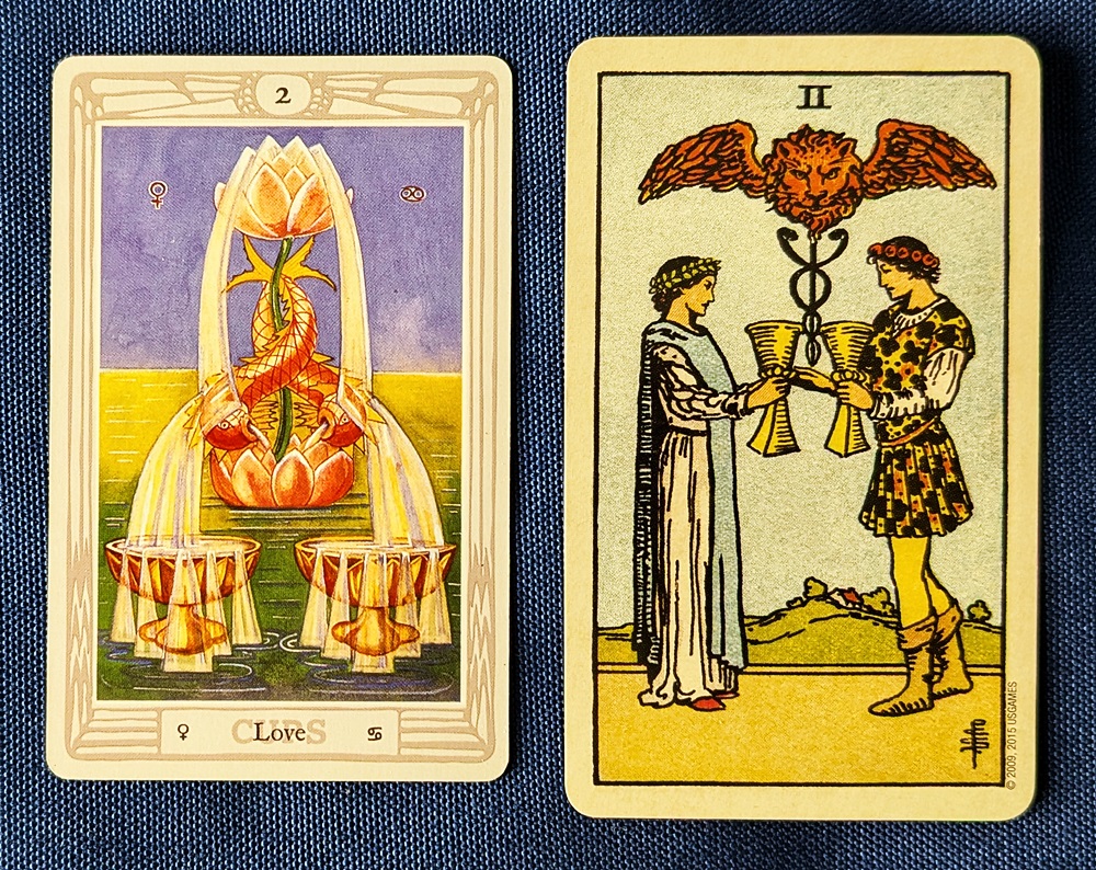 The Thoth 2 of Cups, with its intertwined streams of water, suggests balanced reciprocation of feelings, supporting the assumption that the relationship will be great while it lasts. The RWS 2 of Cups makes this impression even more explicit with its dual offering of chalices. In the Thoth deck the “third party” is represented by the lotus of purity, renewal and the transcendence of Spirit, while in the RWS it could be seen as the caduceus of communication and compromise, with the winged lion indicating desire and pride in the background.