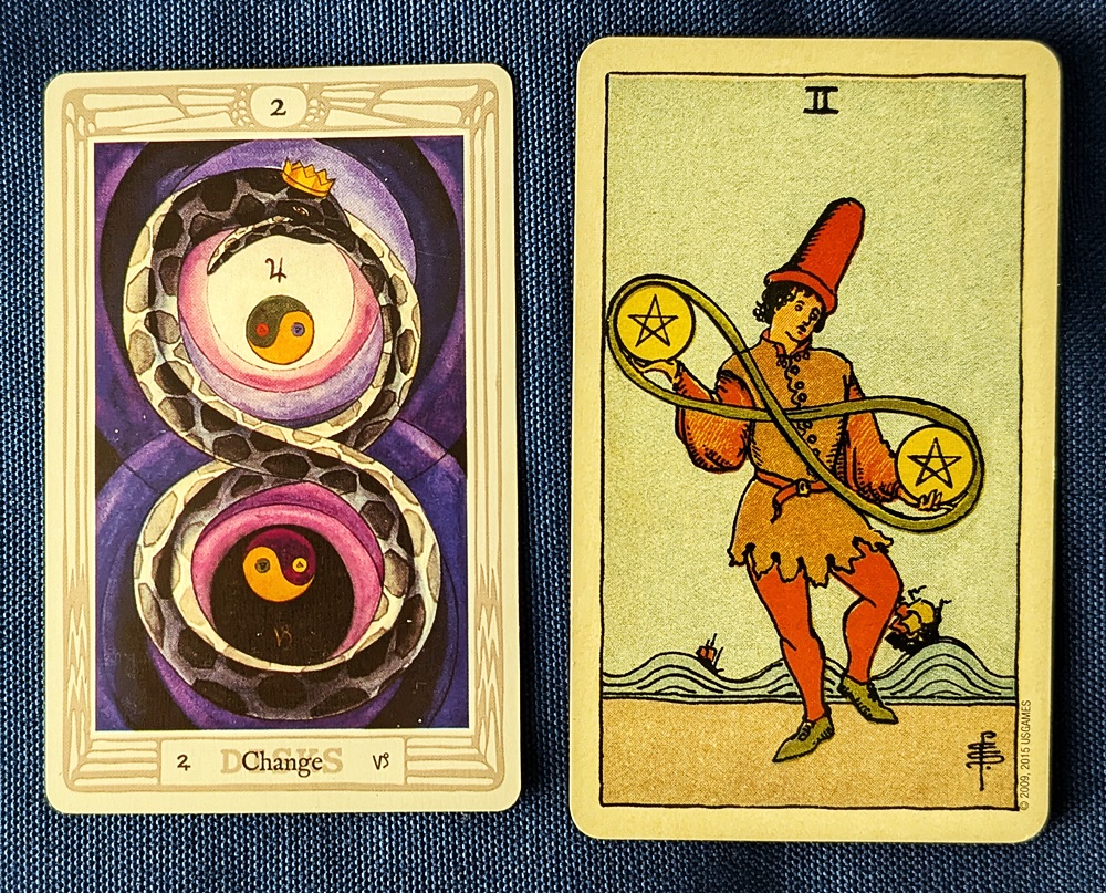 The Thoth 2 of Disks entails pragmatic mediation, producing a negotiated bargain that “throws a bone” to both parties and allows the relationship to advance to a more productive stage by adjusting compensation. The “third party” would be the “yin/yang” symbolism at the center that captures Crowley’s formula “Change=Stability; Stability=Change;” immobility invites stagnation, which this card won’t tolerate. In the RWS 2 of Pentacles, the juggling-and-dancing man is an exemplar of instability; if he stops gyrating he is likely to fall over like a wobbly top at the end of its spin, “losing his marbles” in the process. The “third party” would seem to be the phallic red cap extolling the unruly passions that have upset his balance. Although he doesn’t seem to be up to the task, he must take his metaphorical “manhood” in both hands if he is to stay upright and soldier on.
