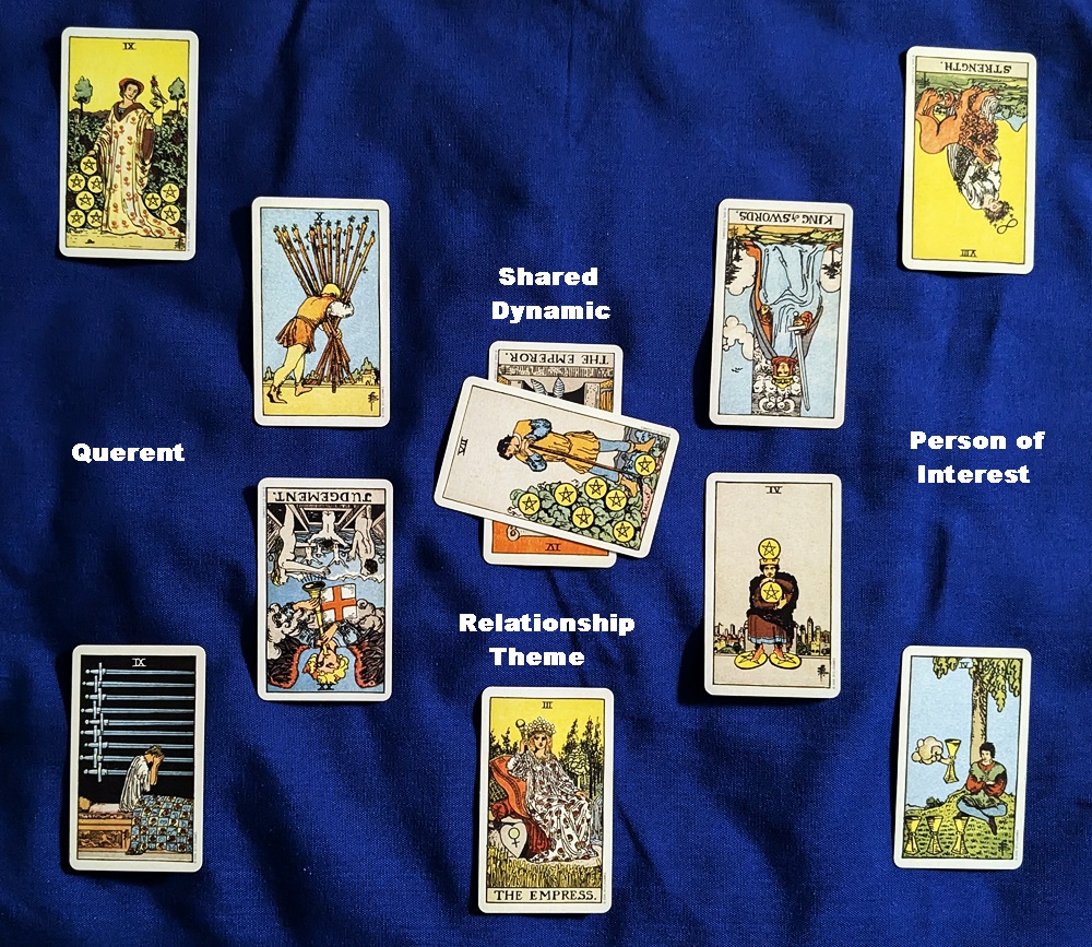 Begin by shuffling a tarot deck while concentrating on the relationship potential. Then deal ten cards face-up in the pattern and order shown. Reversals may be used.