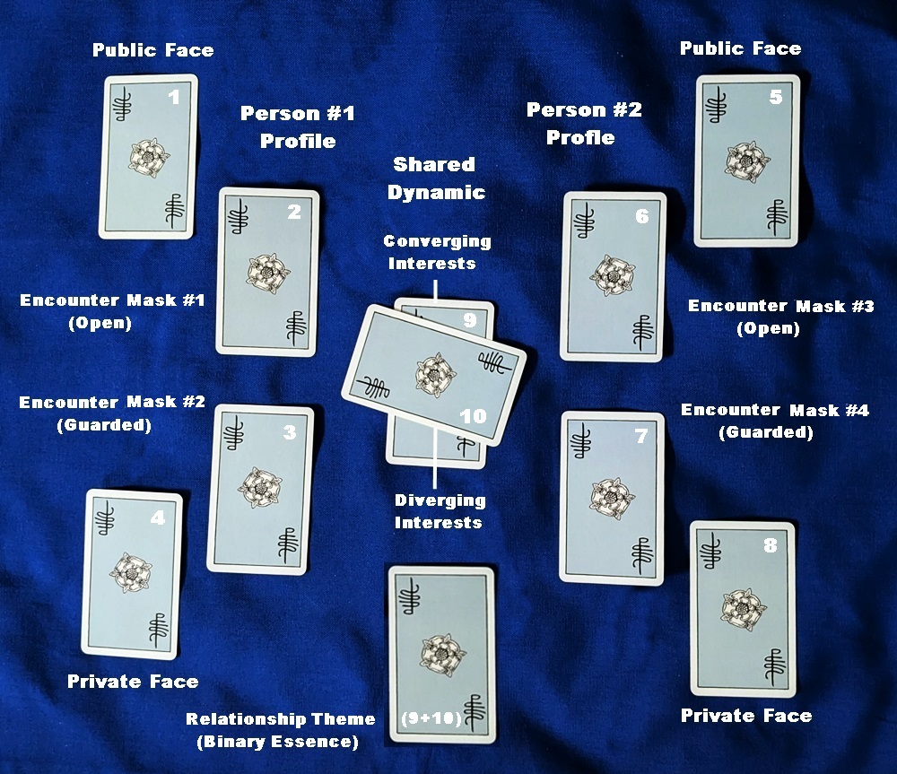 Read Cards 9 and 10 as a sympathetic/antipathetic dichotomy, with converging factors supporting a continued connection and diverging factors edging away from it. These cards can also be read as the pivotal interface between the two pairs of “encounter” cards: 2-9-6, and 3-10-7, creating a more detailed “encounter tableau.”