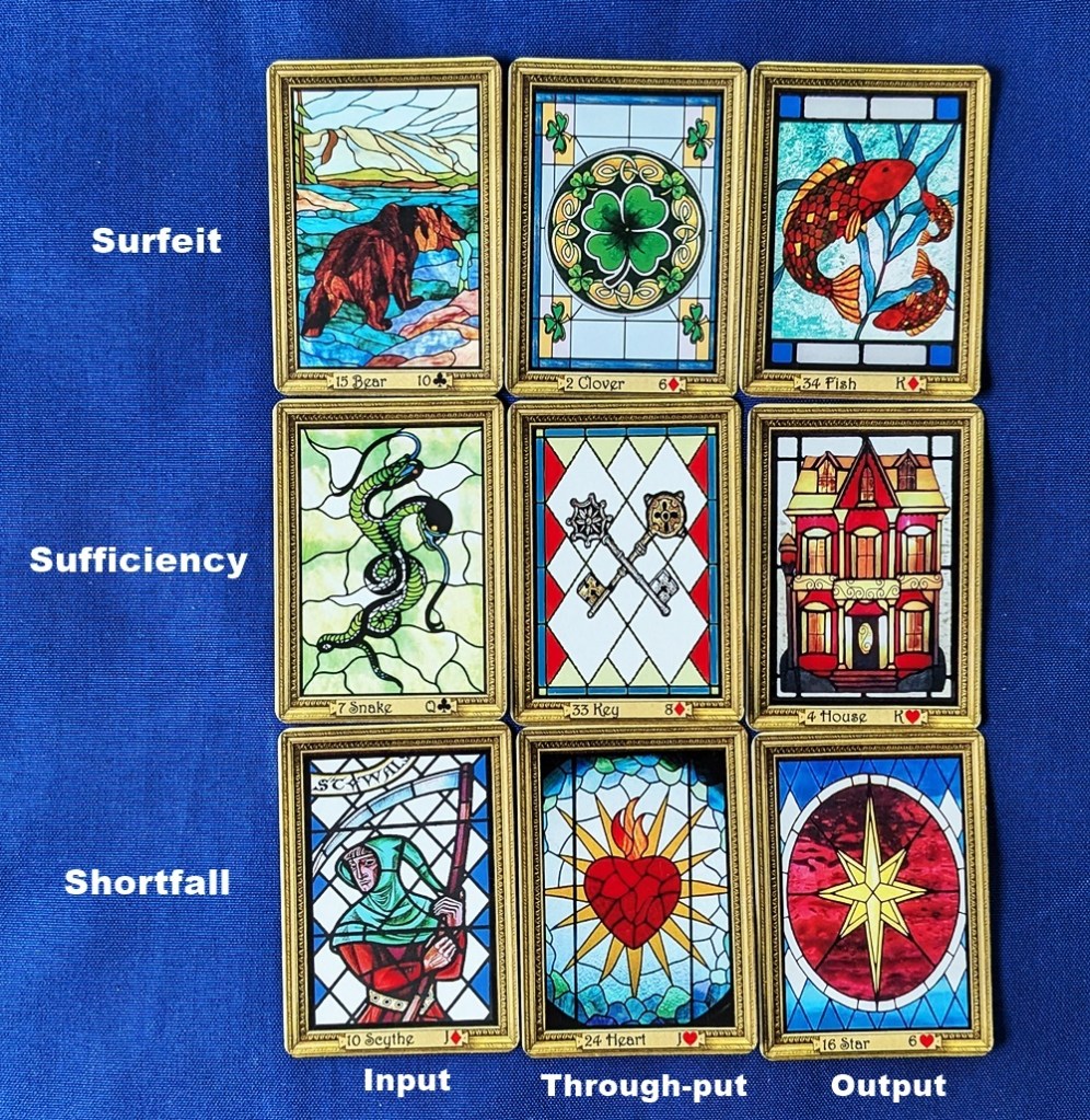 I decided to use this model to create a 9-card, 3×3 Lenormand spread with three tiers of relevance: a top row showing a “surfeit” (an overabundance) of whatever the three-card combination conveys, whether positive or negative; a middle row describing a “sufficiency” of the triune essence (that is, just enough to be taken up and wielded with reasonable effort); and a bottom row reflecting a “shortfall” in actualizing the three-phase impact that would require vigorous engagement to recoup or offset. This has similarities to the premise of the Grand Tableau that the cards above the Significator are highly influential in directing the querent’s actions while those below encourage (or demand) being actively managed in order to optimize their effect.
