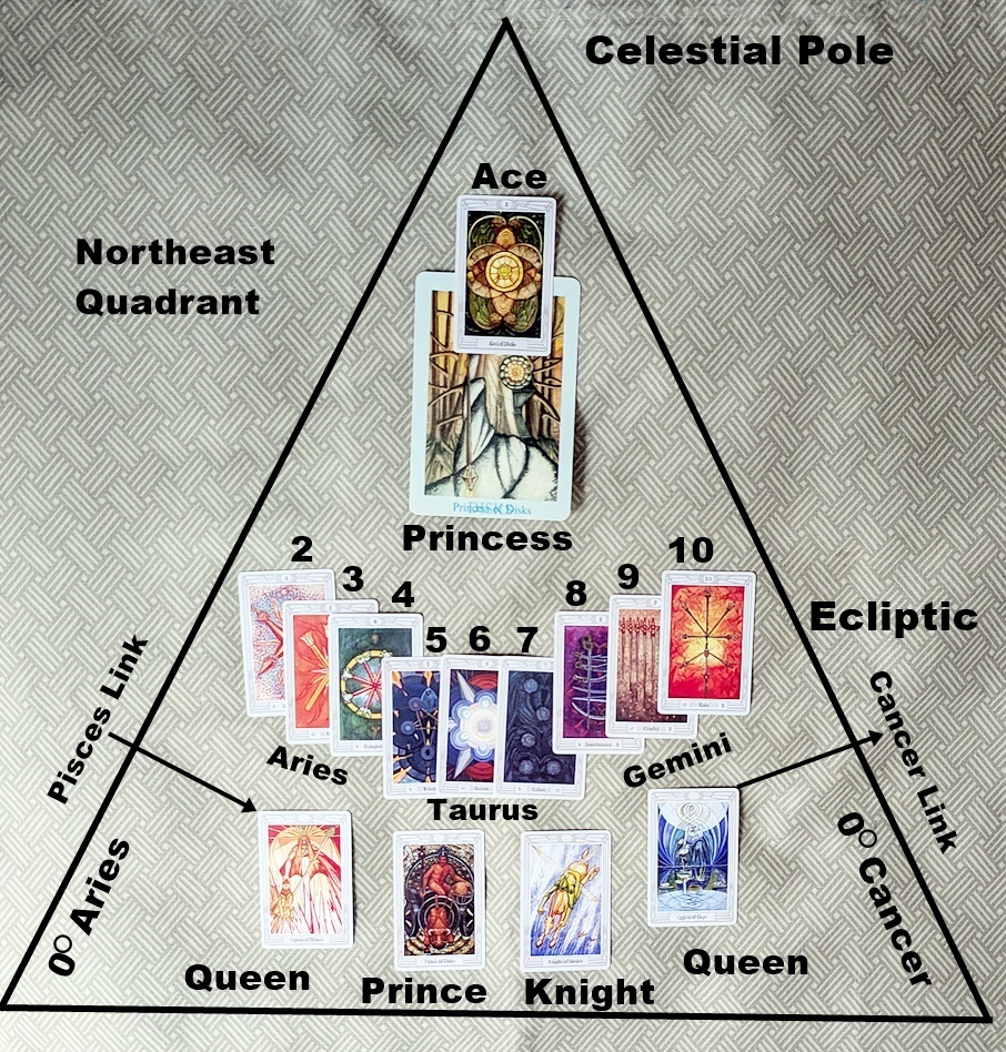 A few explanations are necessary. The Pisces and Cancer “links” are intended to convey the fact that one-third of the Queen of Wands lingers in the last decan of Pisces in the Southeast Quadrant and two-thirds of the Queen of Cups spills over into the first two decans of Cancer in the Northwest Quadrant.