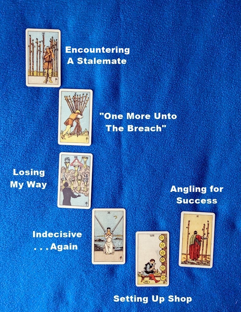 AUTHOR’S NOTE: There are times when it seems that our ability to come up with meaningful conclusions in a tarot reading has deserted us; perhaps the wisdom we seek has receded into the murky depths where we’re not accustomed to going. The usual advice is to just dig deeper and more diligently for a better answer, but this may only lead to further frustration if we try to wring it out of a pull that has been stubbornly resisting us up to that point. Rather than merely scrapping the reading and starting over along the same line of inquiry, here is a spread that I’m proposing as a supplement to revive a moribund attempt. With a couple of twists, it has similarities to the suggestion in The Pictorial Key to the Tarot to use the previous outcome card as the Significator for a new reading.