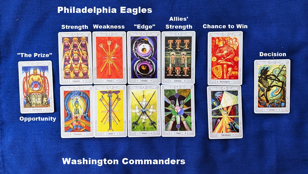 Elementally, the Commandeers’ series is slightly more active and assertive but the Eagle’s “Strength” and “Edge” cards are more in tune with the “Decision” card, intimating the aforementioned “surge” that could carry them to victory. It’s also noteworthy that, even though they are at odds elementally, Death and the Emperor are “numerological counterparts” because 13=1+3=4, giving the Eagles an “inside track” on its interdicting potential.