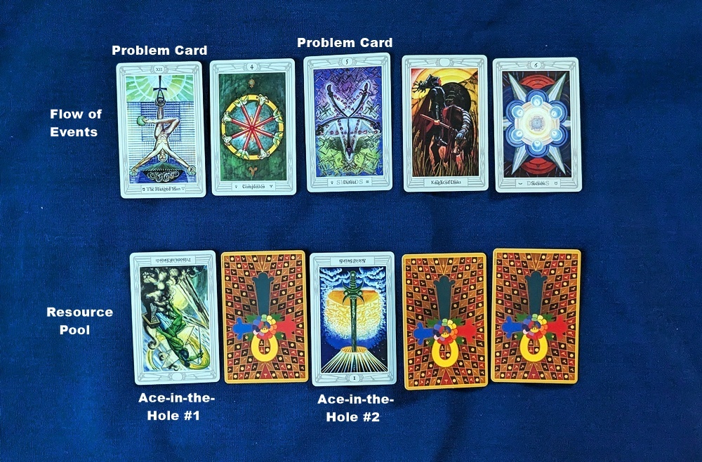 AUTHOR’S NOTE: “Ace in the hole” is a stud poker-players term for a face-down Ace or similar high card that the other players don’t know about until it is played for the win. Here is a spread that uses reversals to create a “resource pool” of hidden cards that can be tapped when the predicted flow of events is unfavorable. Rather than suffering in silence, the querent can attempt to recover by replacing any unforgiving cards with others from the pool that will ideally be more agreeable. Consider it an anticipatory mid-course correction or detour around a foreseen obstacle.