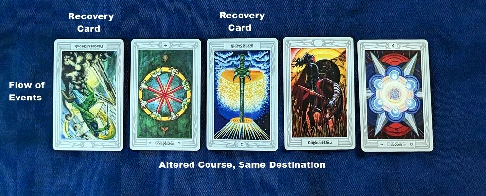 Replace the problem cards in the “Flow of Events” chain with the reversed recovery cards, maintaining their orientation. Read the reconstituted five-card line as an alternate narrative that reflects a slight change in course that may or may not arrive at the same destination depending on where in the original pull the recovery had to be initiated. Because the cards are still reversed, they will exhibit a slightly altered mode of delivery and angle of attack for their energy, creating inflection in the story-line. Here is the outcome of the example reading.