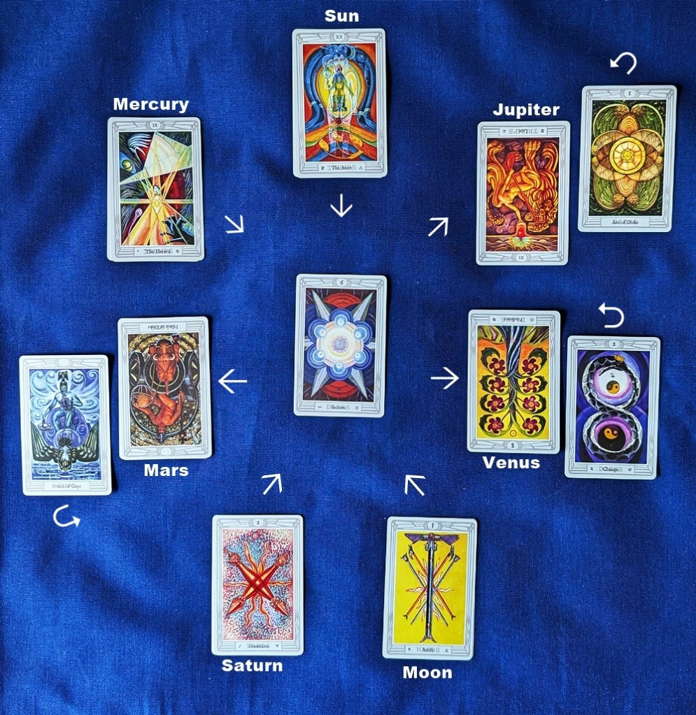 The premise is that all seven planetary powers are always present in the sky and available to enlist in our cause even though they may not be arranged in a traditional aspect pattern that modifies their potency, and may not tie in with their natal positions in the horoscope of the person or entity of interest; such refinements are beyond my scope here. A pull of seven additional cards is made to provide the “triggers” that awaken the archetypal energies, which are delivered by the random cards along the “lines of force” described by the star if upright or directed away from the goal if reversed.*