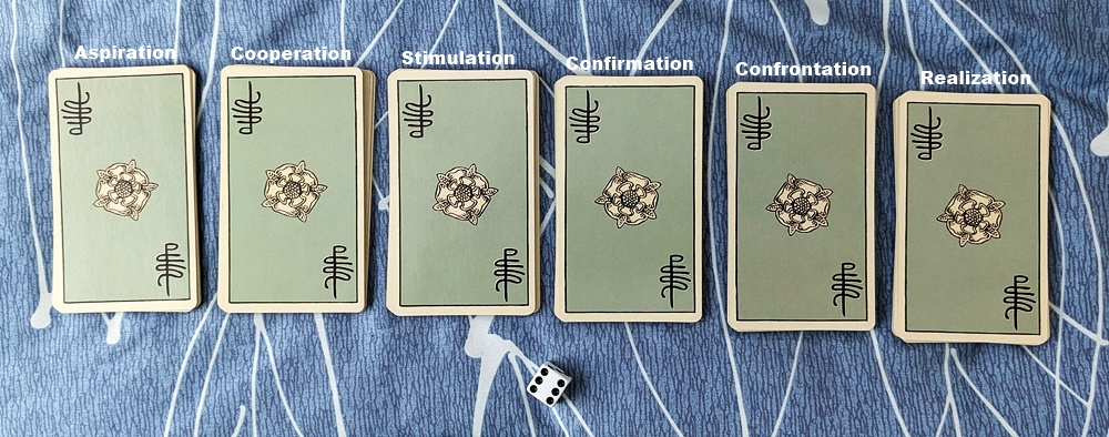 Once the cards are dealt, roll a single six-sided die to chose one of the sub-packs to convey the scope of the narrative. Then turn over the top card of that group and interpret it as the overarching message of the reading-to-come.