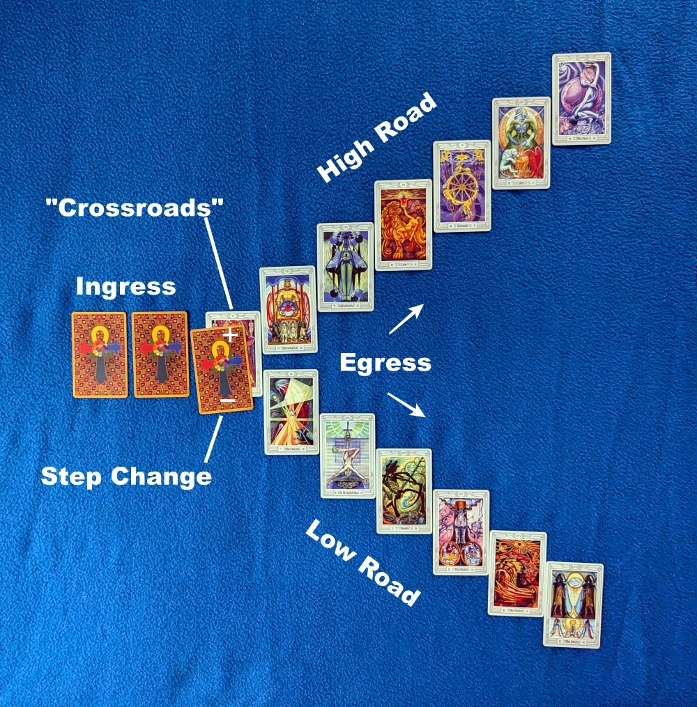 To populate the reading template, I made an effort to divide the twelve subsequent trump cards in an even-handed fashion, with the more encouraging cards pursuing the “high road” and the less hopeful ones descending along the “low road.” The two “Ingress” cards – which can be selected intentionally or pulled randomly – describe approaching the crossroads with a dilemma in hand that is in urgent need of guidance regarding how it should be handled. The “Step Change” card depicts the critical move that will indicate taking either a firm step in a positive direction or a false step down the road to discontent.